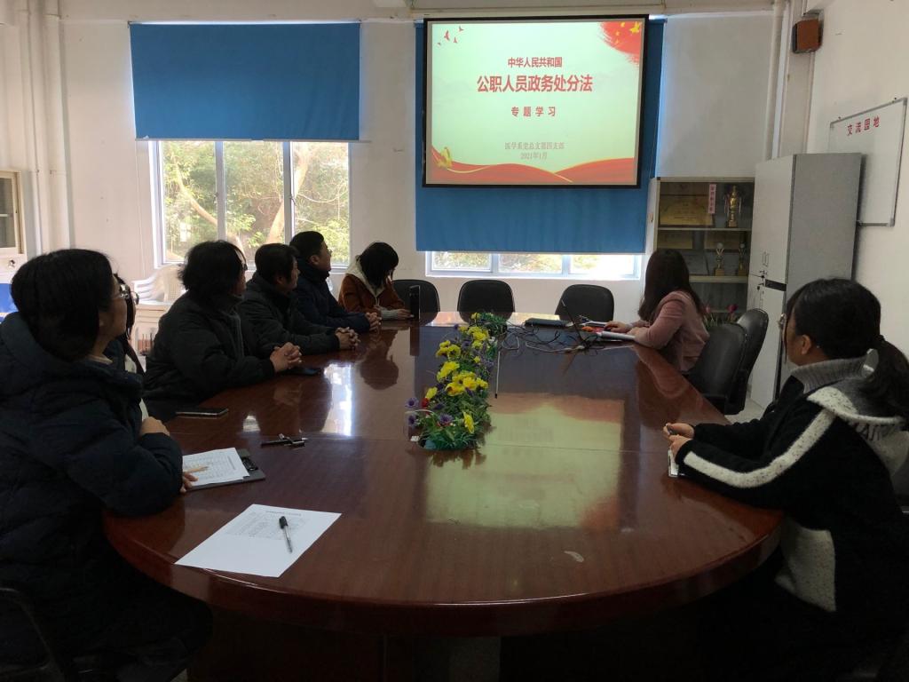 2021年1月14日,医学系第四支部开展“深入学习《中华人民共和国公职人员政务处分法》”主题党日活动。活动在医学基础部215会议室进行,会议由支部书记邓元荣主持。