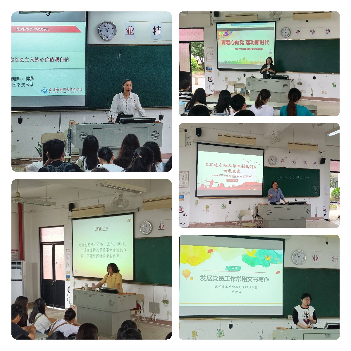 医学技术系党总支副书记林燕围绕社会主义核心价值观为学员们上党课,她强调新时代大学生要重视社会主义核心价值观的培育,争做社会主义核心价值观模范践行者;党总支委员陈念文围绕“怎样成为一名合格的大学生党员”主题,站在学生视角,详细剖析新时代学生党员的要求;学生第一党支部书记龙梅梅以《青春心向党,建功新时代》为题,结合职业发展规划和就业指导,引导学员们脚踏实地、以行动入党;学生第二党支部书记蒋程序领学《习近平与大学生朋友们》,引导学员们深入感受到人民领袖对青年一代的亲切关怀和殷切期望,坚定做一名新时代有志有为青年的信念;党总支专职组织员黄玲云开展发展党员工作常用文书写作指导,引导学员们及时向党组织汇报思想动态,积极接受党组织和培养人的指导意见。