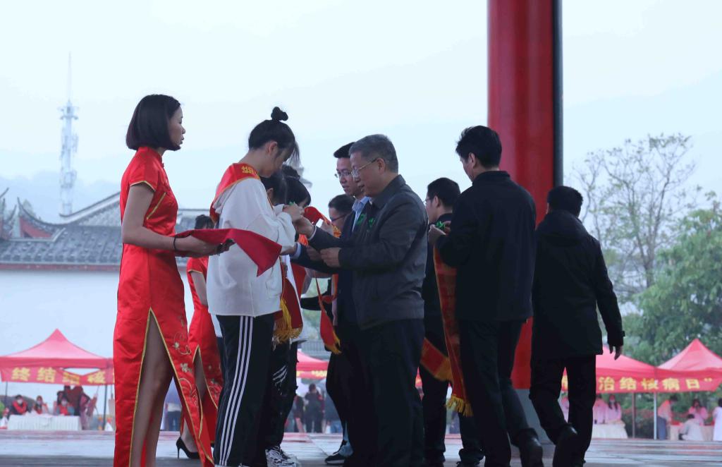 领导来宾为志愿者代表颁发绶带、佩戴绿丝带