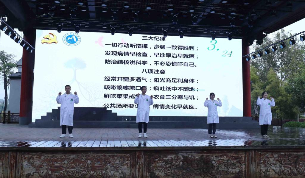 科普宣传义诊,抗结核齐行动。本次活动通过宣传海报、悬挂宣传条幅、表演24式太极拳、诵读结核病三字经、发放结核病防治宣传手册等活动积极开展宣传,群众反响热烈,积极参与互动。同时开展血压检测、血糖检测、健康咨询等义诊活动有针对性地为群众讲解结核病的防治知识,提高群众对结核病防护意识和自身健康的重视度。形成全民防治结核病的强大合力,为实现终结结核病目标而共同努力。
