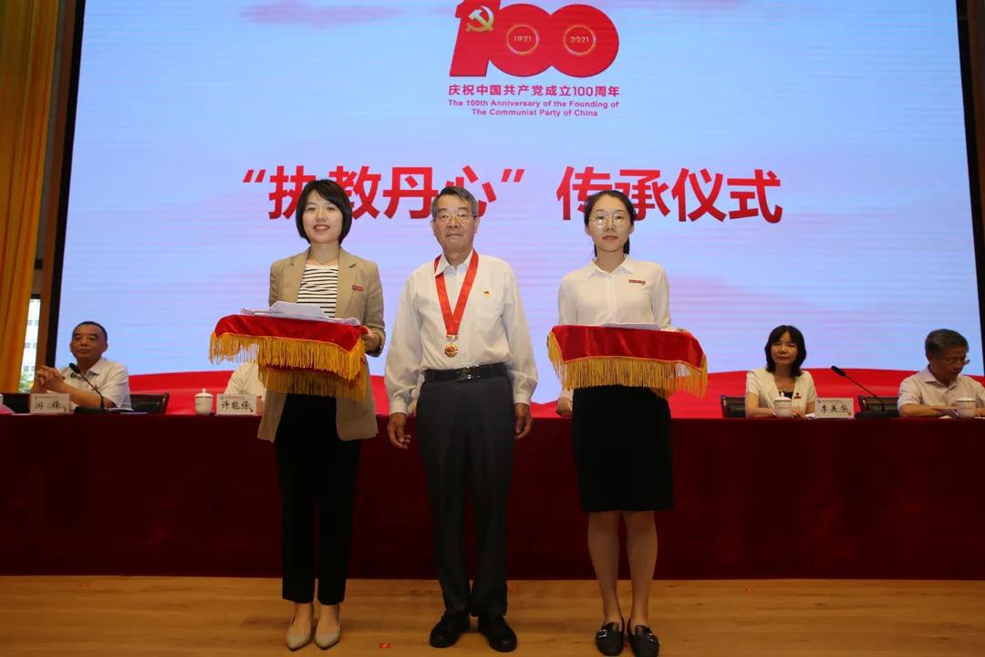 会议首先进行了“光荣在党50年”纪念章的颁发,之后由获得纪念章的老党员教师代表为新入党的年轻党员教师代表进行“执教丹心”传承仪式。丹心执教数十载,老党员教师见证了学校的沧桑变化,传承给年轻一辈不变的白衣坚守。