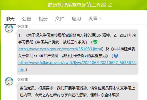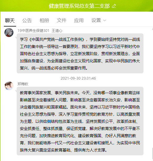 9月30日,健康管理系党总支第二支部组织全体师生党员开展专题学习交流会,学习《关于深入学习宣传贯彻党的教育方针的通知》精神、《中国共产党统一战线工作条例》及《中共福建省委关于贯彻<中国共产党统一战线工作条例>的实施意见》。会议由支部书记张凯捷主持。
