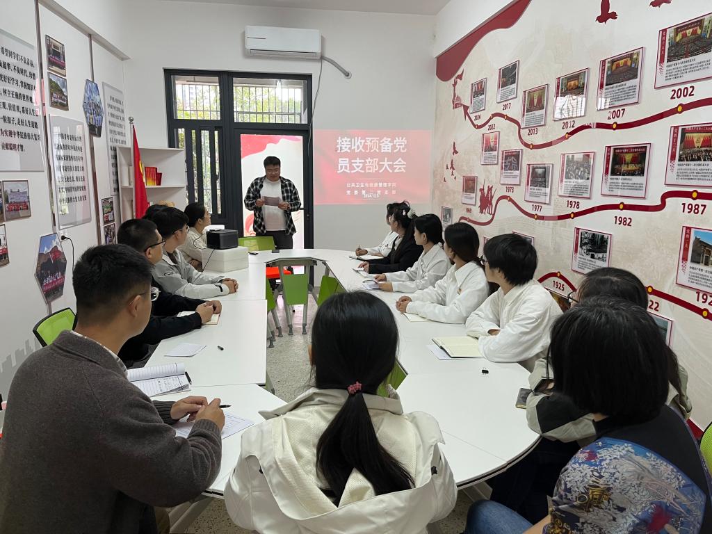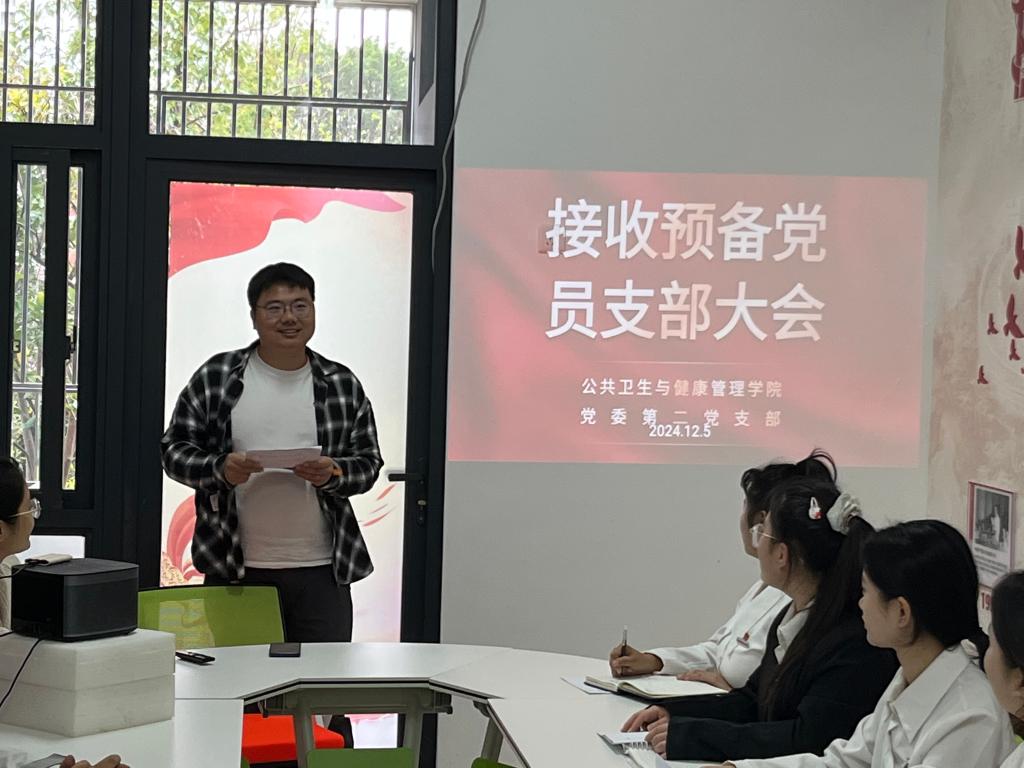 为进一步加强基层党员队伍建设,做好党员发展工作,12月5日,公共卫生与健康管理学院党委第二党支部召开党员大会,讨论接收翁建婷等6名同志为中共预备党员的事宜,会议由党支部书记张凯捷主持。