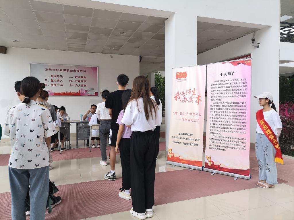 本次活动特别邀请了福建工程学院法学院副教授王崇能,现场提供法律咨询服务,为我校师生答疑解惑。王崇能副教授,福建建达律师事务所高级律师,自1996年从事律师职业至今,办理了700起以上各类诉讼仲裁案件,擅长海事海商、国际贸易、保险等领域的民事争议案件。