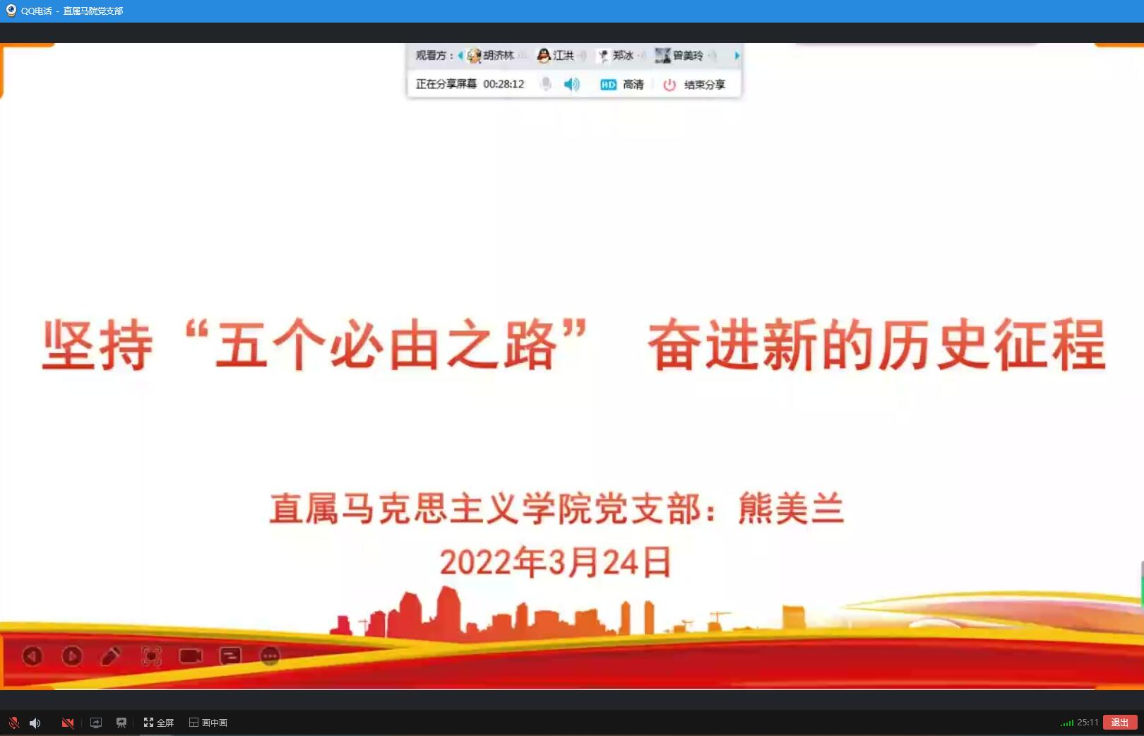 为了更好地学习宣传贯彻两会精神,2022年3月24日上午,直属马克思主义学院党支部熊美兰书记通过QQ群平台线上为党支部作了题为“坚持‘五个必由之路’ 奋进新的历史征程”党课。支部全体党员同志参加学习。