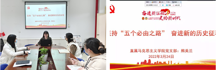 当前,福建省新冠肺炎疫情仍在持续,防控形势依然十分严峻。我校直属马克思主义学院党支部开启“云党建”模式——党支部书记熊美兰化身“主播”,以“双带头人”工作室为主会场,采用线上线下相结合的方式,为全体支部党员作《坚持“五个必由之路” 奋进新的历史征程——学习贯彻2022年全国两会精神》的专题党课,保障党建不断线、学习不断档。