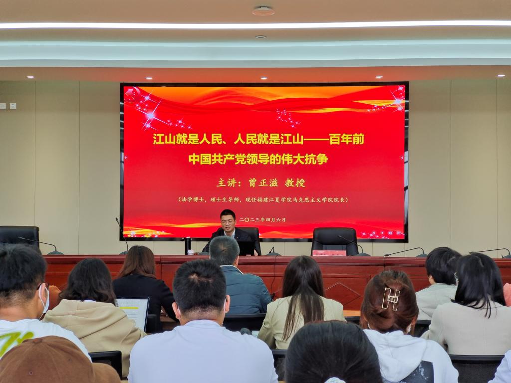 为帮助我校师生坚持不懈用习近平新时代中国特色社会主义思想和党的二十大精神凝心铸魂,进一步学习党的百年奋斗重大成就和历史经验,落实省委“深学争优、敢为争先、实干争效”行动部署,2023年4月6日,我校邀请福建江夏学院马克思主义学院院长曾正滋教授在行政楼六楼会议室作题为《江山就是人民、人民就是江山——百年前中国共产党领导的伟大抗争》专题讲座。中层干部代表、思政课教师、“青马工程”学员及习近平新时代中国特色社会主义思想读书社学生参加讲座,讲座由马克思主义学院院长熊美兰主持。