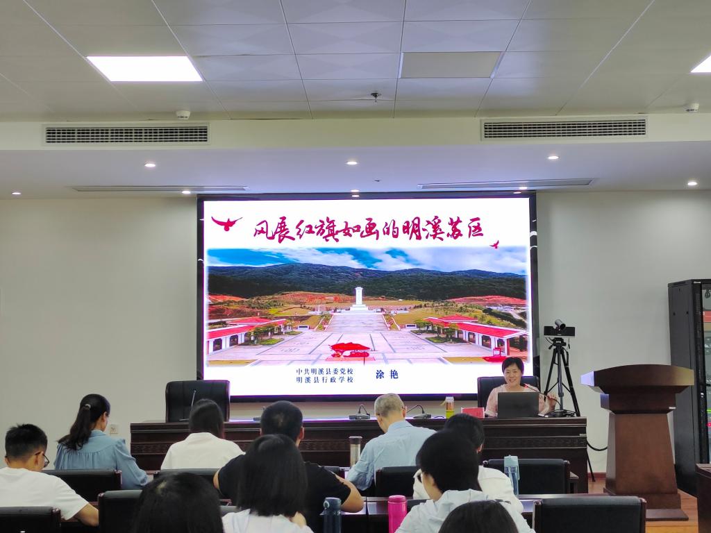 “宁化、清流、归化,路隘林深苔滑。今日向何方,直指武夷山下。山下山下,风展红旗如画。”一首毛泽东同志的《如梦令·元旦》让马院教师重回革命战争年代如火如荼的斗争场景,重温革命先烈用鲜血和生命铸就的苏区精神。在理论教学环节中,明溪县委党校高级讲师涂艳为马院教师作《风展红旗如画的明溪苏区》专题讲座。她从“路隘林深苔滑——血与火的革命实践”“风展红旗如画——谱写时代的新篇章”两部分为教师们上了一堂生动的党史思政课。