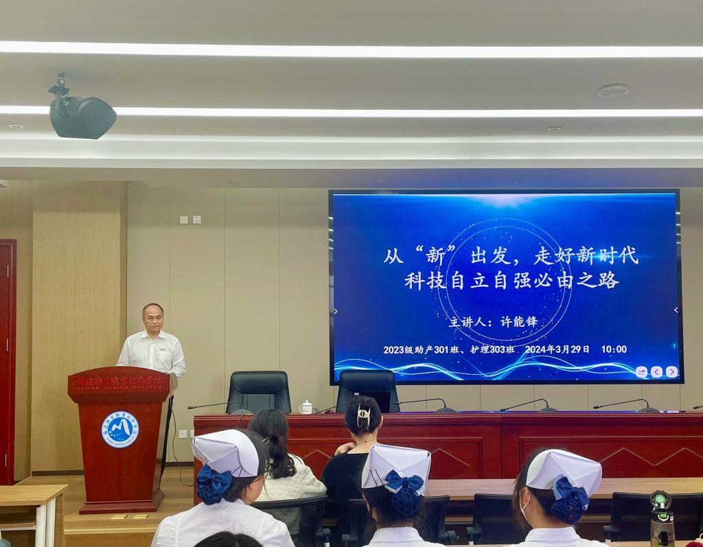许能锋遵循中华科技文明的发展脉络展开讲述,从先人在农、医、天、算等方面缔造出闻名于世的科技成果,到屡次失之交臂的科技革命深刻改变了世界发展格局,再到新中国科技自立自强之路实现了独立自主的蝶变,为师生们为带来了一堂逻辑严谨、理论深刻、视野开阔的形势政策课,深刻阐述了“科技立则民族立,科技强则国家强”的历史意蕴。他寄语师生,应当鉴古通今,观照未来,笃行致远,传承我校优良传统,活化利用现有资源,以科技创新助力健康中国建设。