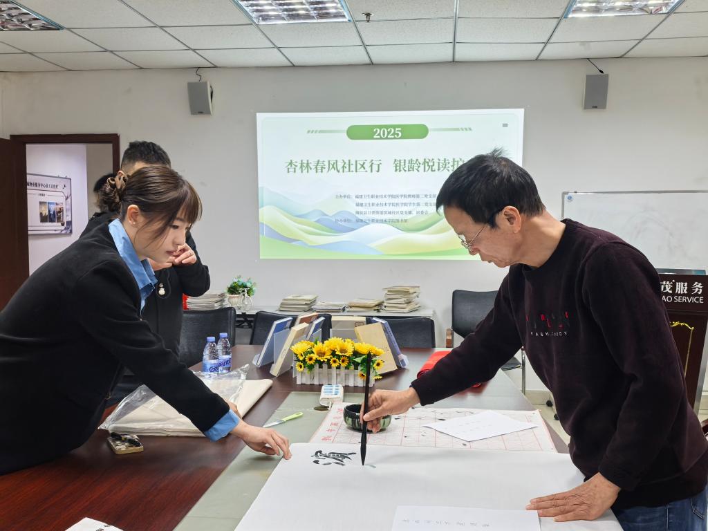 文化互动环节同样精彩纷呈。来自社区的老年书法家萧惠敬挥毫泼墨,题字“滨城闽卫共建健康,校社携手同创福祉”展现了传统文化的魅力。随后,师生们与社区居民们共读图书,分享阅读心得,发表生活感悟,营造了浓厚的文化氛围。
