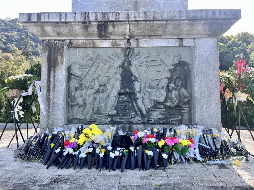 默哀完毕,大家手捧精心准备的纸花缓步上前,轻轻地放在纪念碑前,并有序绕行瞻仰烈士纪念碑一周,以此缅怀革命先烈的丰功伟绩。