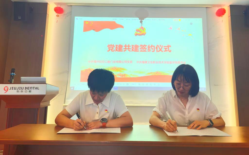 为更好践行和弘扬廖俊波精神,为服务人民群众作出更积极贡献的同时优化医疗卫生人才培养模式,中共福建卫生职业技术学院医学院委员会与中共福州玖玖口腔门诊有限公司支部举行党建共建签约仪式,正式确立结对共建关系。签约仪式后,共建双方分别介绍各自主要工作,就如何深化合作内涵展开讨论,在定期开展健康服务、专业实践、志愿讲解及党建交流等方面达成合作意向。
