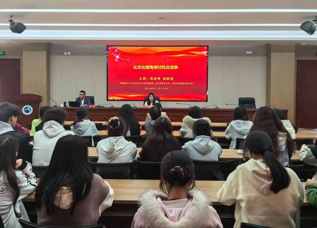 历史是最好的教科书,也是最好的清醒剂。为弘扬以爱国主义为核心的伟大民族精神,激励师生肩负起新的文化使命,11月27日,我校特邀福建理工大学马克思主义学院陈亚峰副教授在厚德楼六楼会议室作题为《从文化视角探讨抗日战争》的“中国共产党人精神谱系”专题宣讲。讲座由马克思主义学院副院长杨盈主持,马克思主义学院全体专兼课教师、学生代表参加。