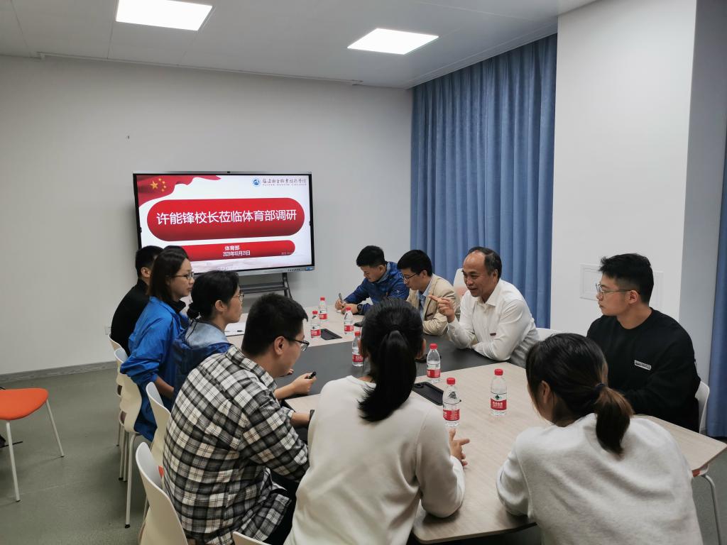 2021年10月21日,许能锋校长走进体育部,召开“党建业务相融合 两轮驱动促发展”座谈会。会议由体育部副主任阮秋容主持,体育部全体教职工参会。