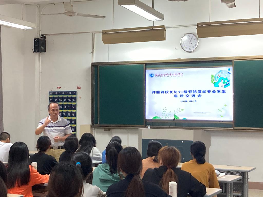 10月19日下午,校长许能锋在教学楼203为21预防医学专业学生开展座谈会,预防班全体48位同学参加会议。