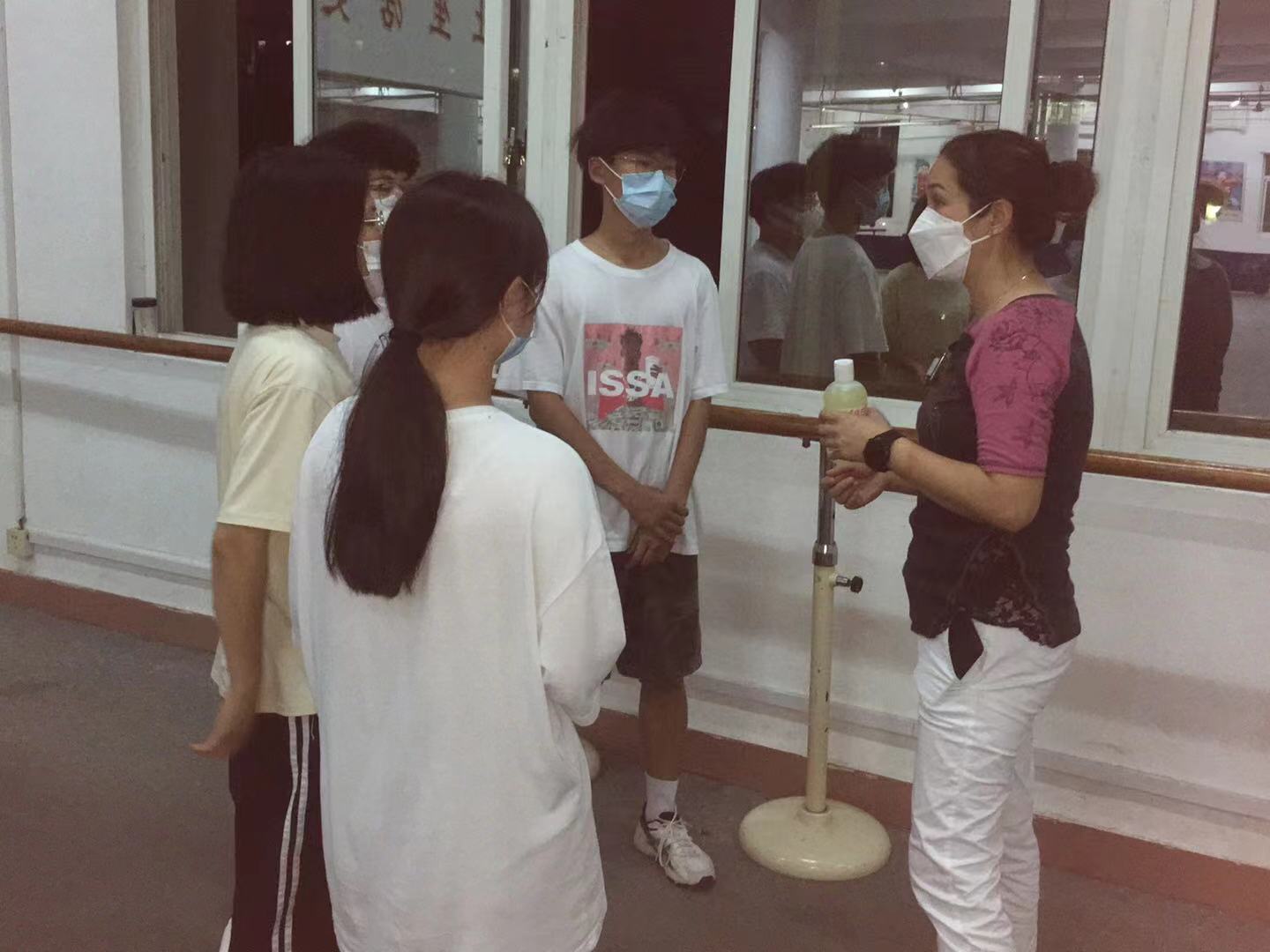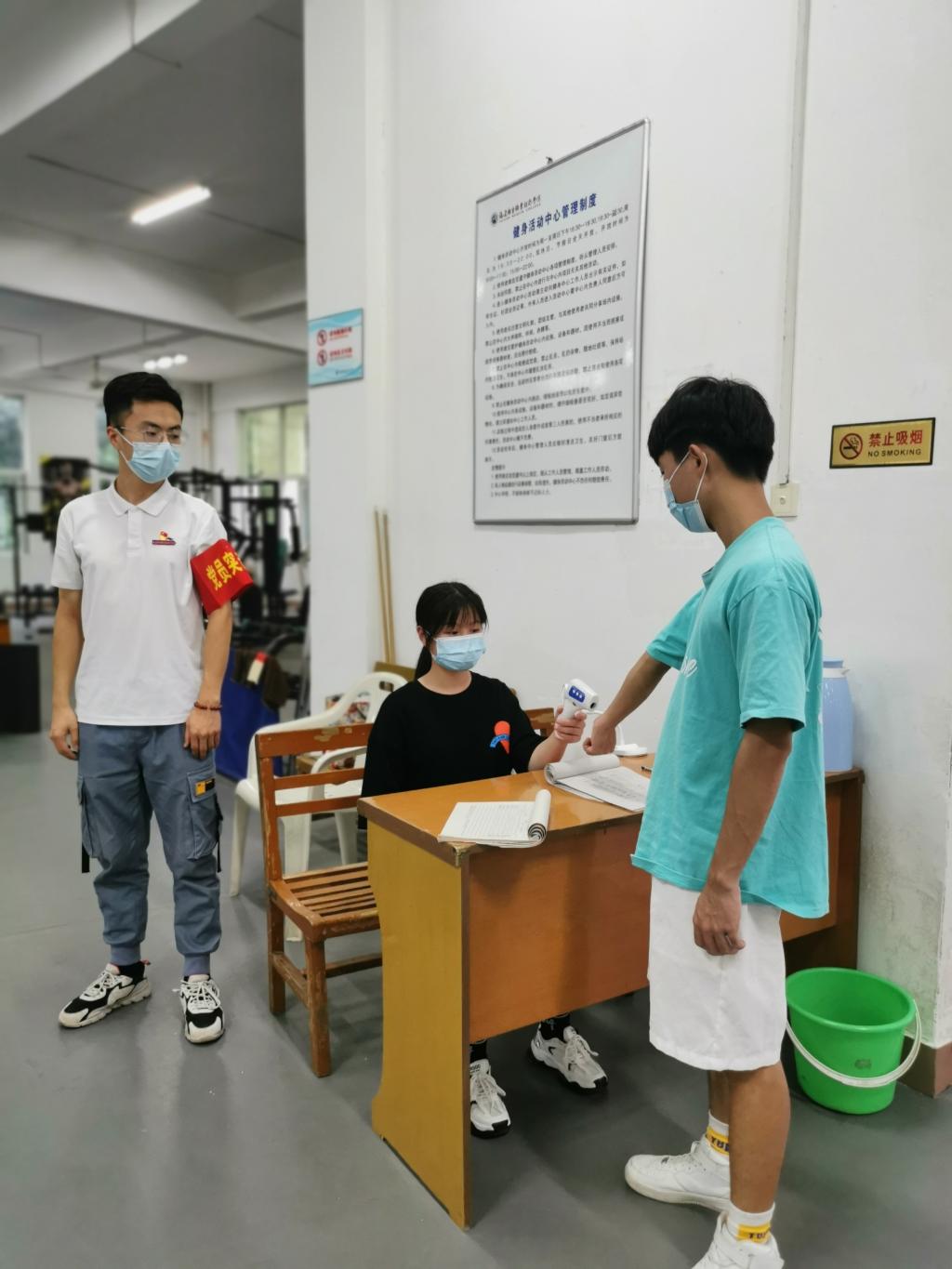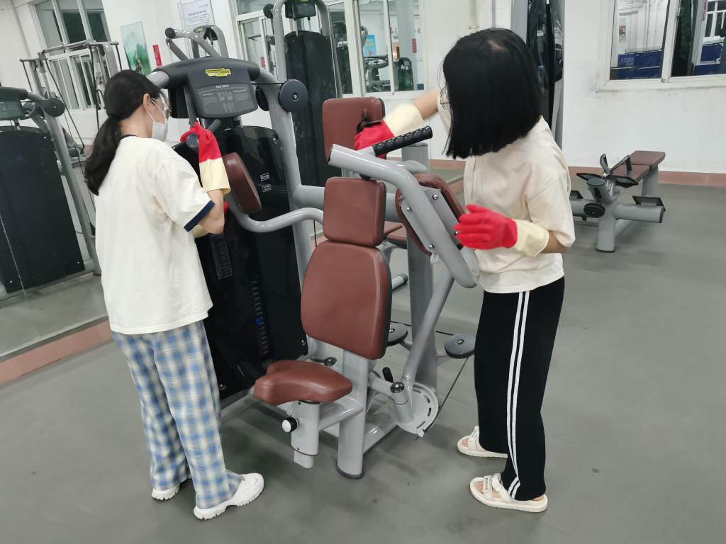 疫情期间,体育场馆在做好疫情防控的基础上对全体师生开放,邀请物业经理黄榕对学生志愿者进行消杀培训。师生活动中心的器械每天都有志愿者用消毒水定时擦拭,地面由物业每天定时消杀,场地保持通风。