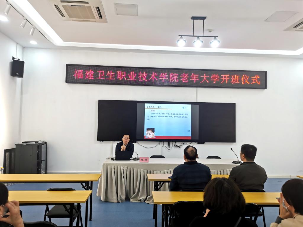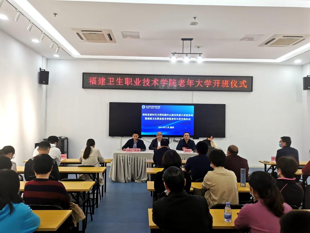 11月20日,福建卫生职业技术学院在闽侯县新时代文明实践中心举行首场周末科普大讲堂活动暨老年大学开班仪式。医学系党总支书记邱滚忠,副主任林国威、陈铭及学校师生代表参加;闽侯县科学技术协会主席潘桂光、县委文明办副主任叶晓丛、闽侯县委宣传部、县融媒体中心、防震减灾中心等部门相关人员受邀出席,共有50余人参加活动。活动由继续教育学院副院长何烜主持。