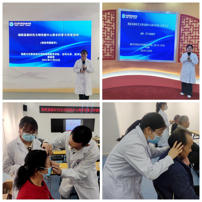开班结束后,陈铭为学员们带来周末科普大讲堂第一课——常见穴位与保健推拿。通俗易懂、简便易学的内容,帮助学员们了解日常穴位与保健推拿对老年人健康与长寿的重要性,使学员们正确认识健康养生方法。医学系教师叶汝萍、蔡唐彦为学员们带来刮痧、耳穴、推拿等实践课程,并组织学生为在场的老年学员们进行义诊服务。授课现场氛围热烈,学员们对我校老年大学的课程设置给与一致好评,期待我校老年大学带来更多实用有趣的课程内容。