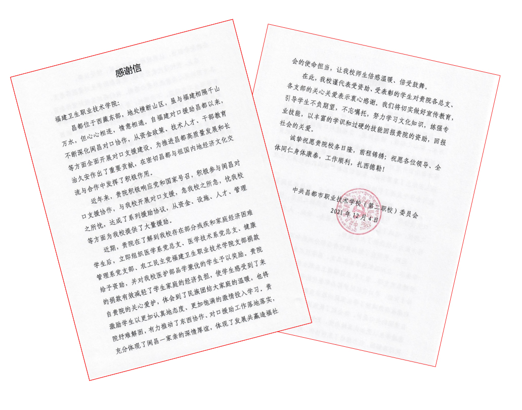 昌都市职业技术学校党委委员、副校长蒋昆对我校的爱心捐助表示衷心感谢,他指出,这份跨越千山万水的爱心不仅给困难家庭学生带来一定的经济帮助,更使广大学生感受到了来自福建卫生职业技术学院的深切关心,让全体师生倍感温暖、倍受鼓舞,充分体现了闽昌一家亲的深情厚谊和发展共赢造福社会的使命担当,将激励学生以更加认真的态度、更加饱满的激情投入文化知识学习,练强专业技能,以丰富的学识和过硬的技能为祖国、为社会做出积极贡献。同时,中共昌都市职业技术学校(第二职校)委员会向我校发来一封感谢信。