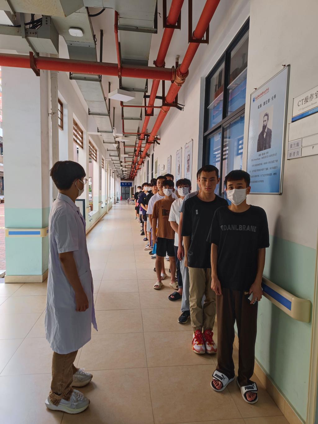 2022年9月9日至18日,在门诊部DR室门口,学生每隔1米整齐列队,有序等候,他们正在参加我校联影医学影像产业学院联合门诊部组织的新生入学胸片体检。