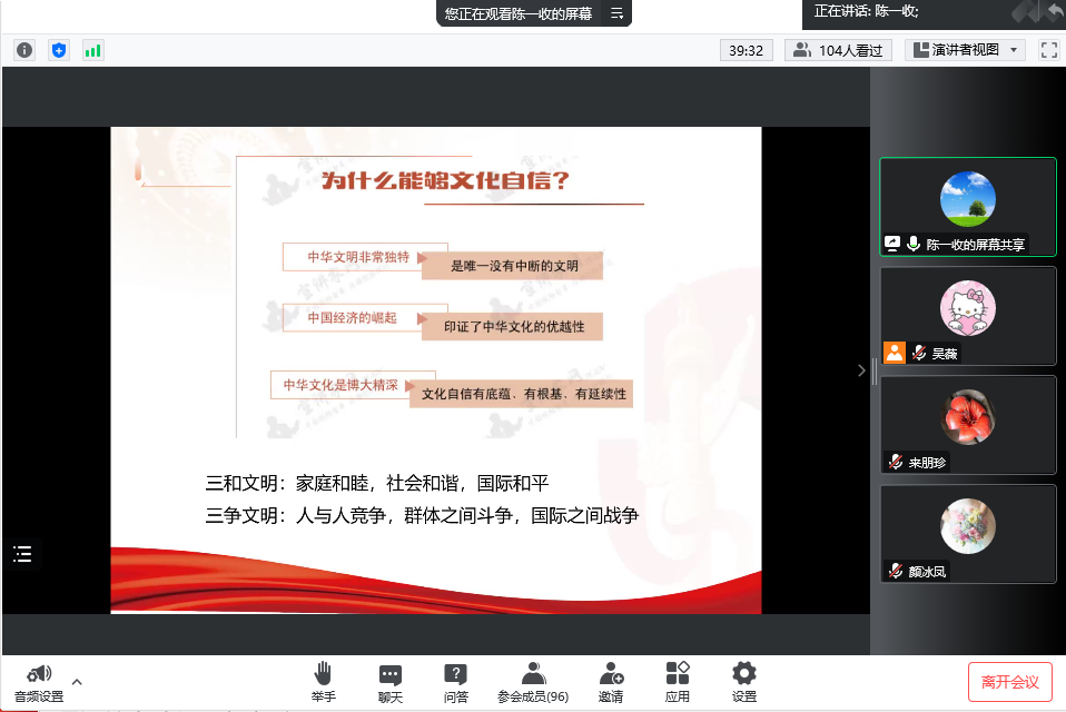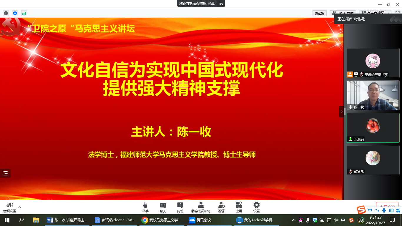 为帮助我校师生学习贯彻党的二十大精神,从中华优秀传统文化中汲取思想精华,从百年党史中感悟文化自信,2022年10月27日,我校马克思主义学院邀请福建师范大学马克思主义学院教授、博士生导师,福建省高校“两学一做”专题课程主讲人陈一收作题为《文化自信为实现中国式现代化提供强大精神支撑》专题讲座。讲座由马克思主义学院副院长来朋珍主持,全体思政课教师及医学技术系学生代表以线上方式参与。