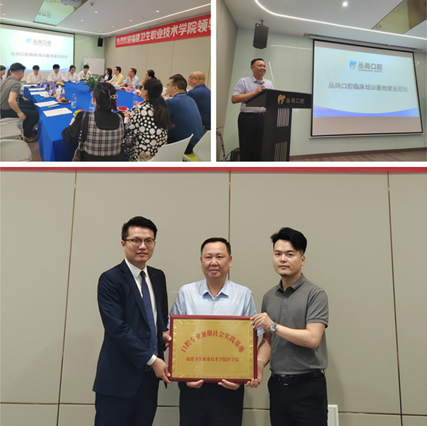 在丛尚口腔门诊的座谈会上,该企业陆煜昭院长简要介绍了企业的组织架构和经营情况,并对丛尚口腔临床培训基地建设规划做了详细介绍,表示出了高度的合作意愿,期待有更多我校优秀学生加入到企业中来。曾武祈从学校历史沿革、办学规模、学科建设等方面介绍了学校的基本情况,并对企业所做的口腔临床培训基地建设规划表示充分肯定。希望以校企合作为契机,进一步加强双方在人才培养方面的合作,提升人才培养质量,满足毕业生高质量就业的迫切需求。座谈会后,曾武祈为企业授牌,在开展暑期社会实践方面达成初步合作。