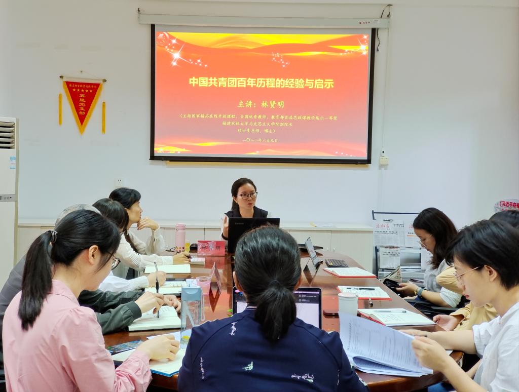 为从中国共青团百年历程中汲取精神力量,做好青年思想政治教育工作,2022年6月9日,我校马克思主义学院邀请福建农林大学马克思主义学院副院长林贤明作题为《中国共青团百年历程的经验与启示》的专题讲座。讲座由马克思主义学院院长熊美兰主持,全体专兼职思政课教师、学生代表参加讲座。