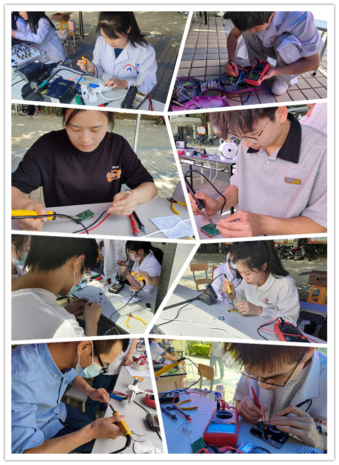 活动现场,工作人员积极向同学们科普科技小知识,带领同学们参观各个活动区域并介绍各区域的分工;利用平时学到的专业知识,对同学们送来的故障小电器进行现场检测和维修。他们专注的模样也吸引了过往师生驻足旁观,有的甚至申请亲自动手尝试,感受焊接的魅力。参加维修活动的同学互相配合、学习探讨,每修好一件电器,大家都非常开心,在求知与实践中收获了满满的快乐与成就感。