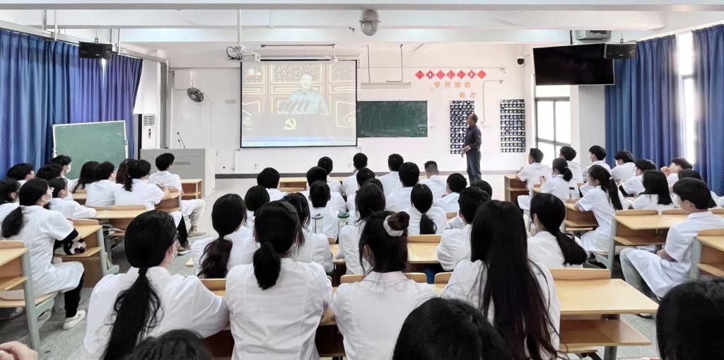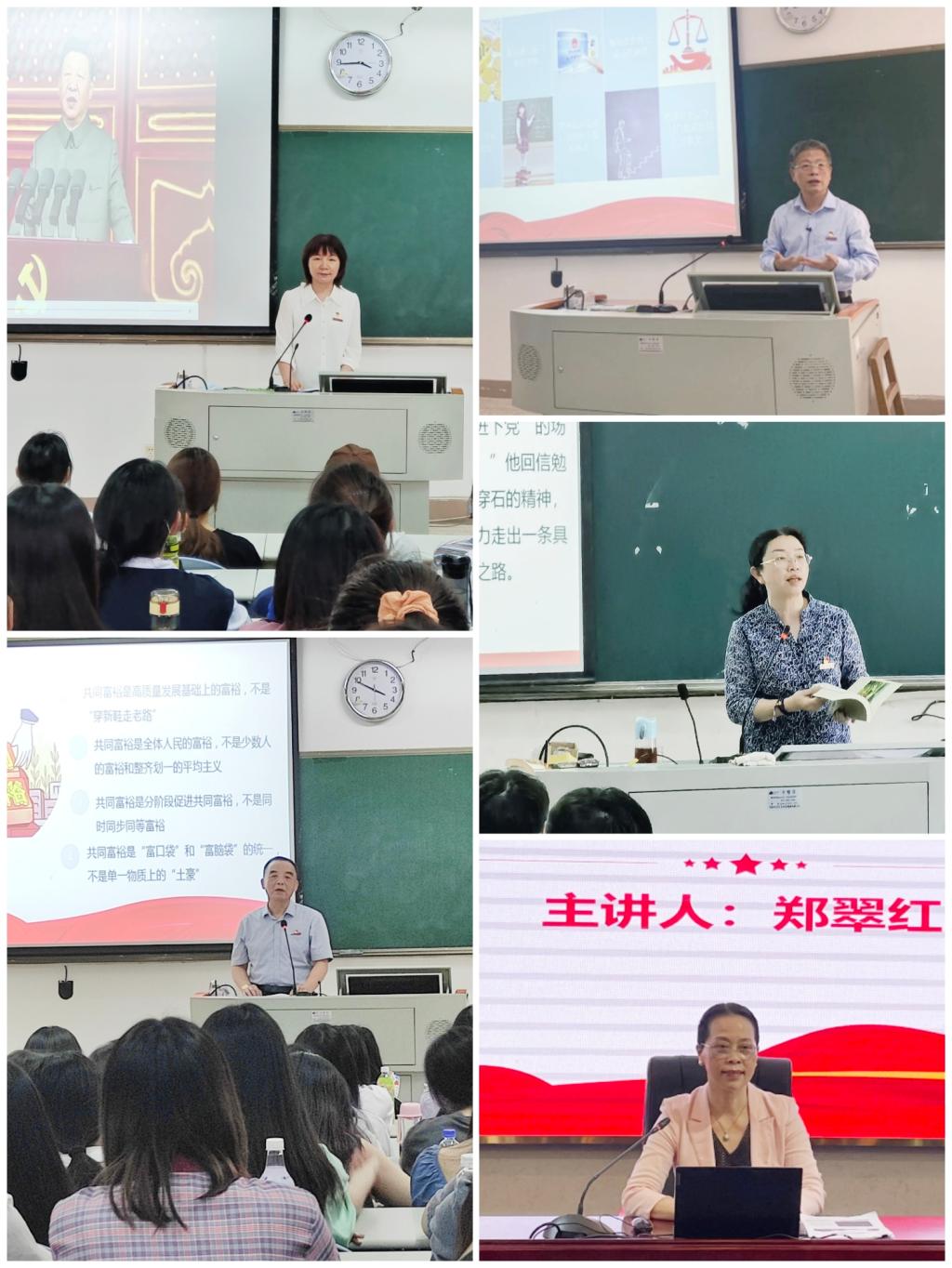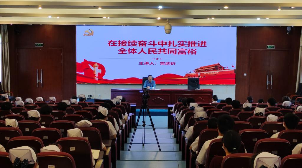 李美华、游锋、陈贞健、黄铭珊、郑翠红带领广大师生回顾了我校在“十三五”期间,建设资助工作规范化的学生资助中心、精准帮扶经济困难学生完成学业,为社会培训乡村医生、输送医疗护理员等助力共同富裕取得的实绩。在此基础上展望了我校“十四五”规划的发展蓝图。通过他们的宣讲,广大师生受益匪浅,充分认识到征途漫漫,惟有奋斗,只要坚持不懈地以实干创实绩、以奋斗促富裕,定能汇聚起磅礴力量,让共同富裕的美好图景展现在神州大地。