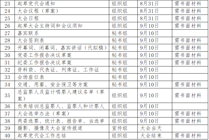 主要任务:起草召开党员代表大会的请示、报告、通知;组织指导代表的选举工作,汇总代表名单,提出列席人员、邀请人员名单;编制代表名册和代表编组名单;提出大会主席团、秘书长建议名单,以及大会执行主席的分组建议名单;组织党委委员和纪委委员候选人预备人选的酝酿、民主推荐和考察工作,起草候选人的基本情况介绍;起草选举办法和填写选票注意事项的说明,印制选票;安排大会日程,负责统计每天到会人数;起草大会各种会议的主持词;培训总监票人、监票人和计票人;做好党委、纪委第一次全体会议选举的准备和组织工作;负责上述文件的打印、校对、装订及分发。