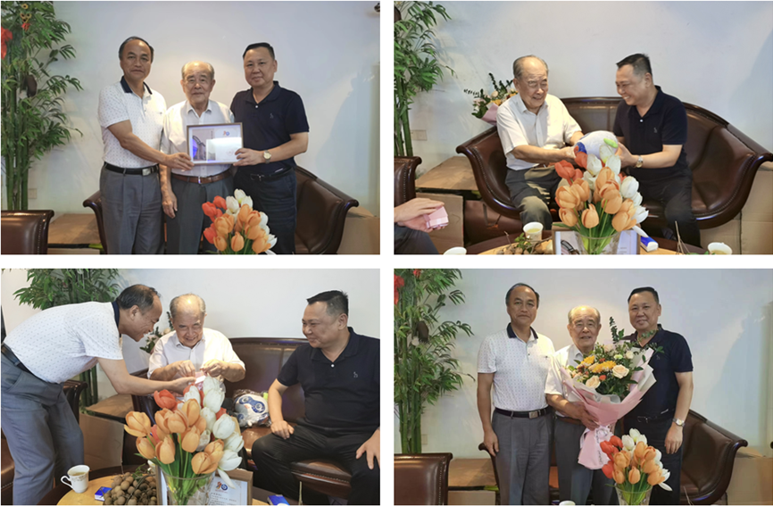 曾武祈代表学校向陈奎校友赠送了精心准备的110周年校友纪念卡、校园吉祥物和校徽、校标,并献上鲜花。看着纪念卡上的老照片,陈奎校友回忆起当年在母校的学习、生活,非常惊喜和感动。曾武祈、许能锋向陈奎校友介绍了学校近年发展情况,特别是双高校建设以及学校的发展规划。陈奎校友十分关心母校的发展,为母校取得的成绩感到由衷地高兴。