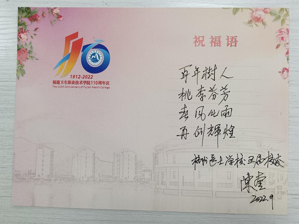 临别之际,陈奎校友向学校一行赠送了他亲自牵头编著的《0-3岁儿童早期发展指导——育儿宝典》,并手书母校110周年校庆祝福语:百年树人,桃李芬芳。春风化雨,再创辉煌!