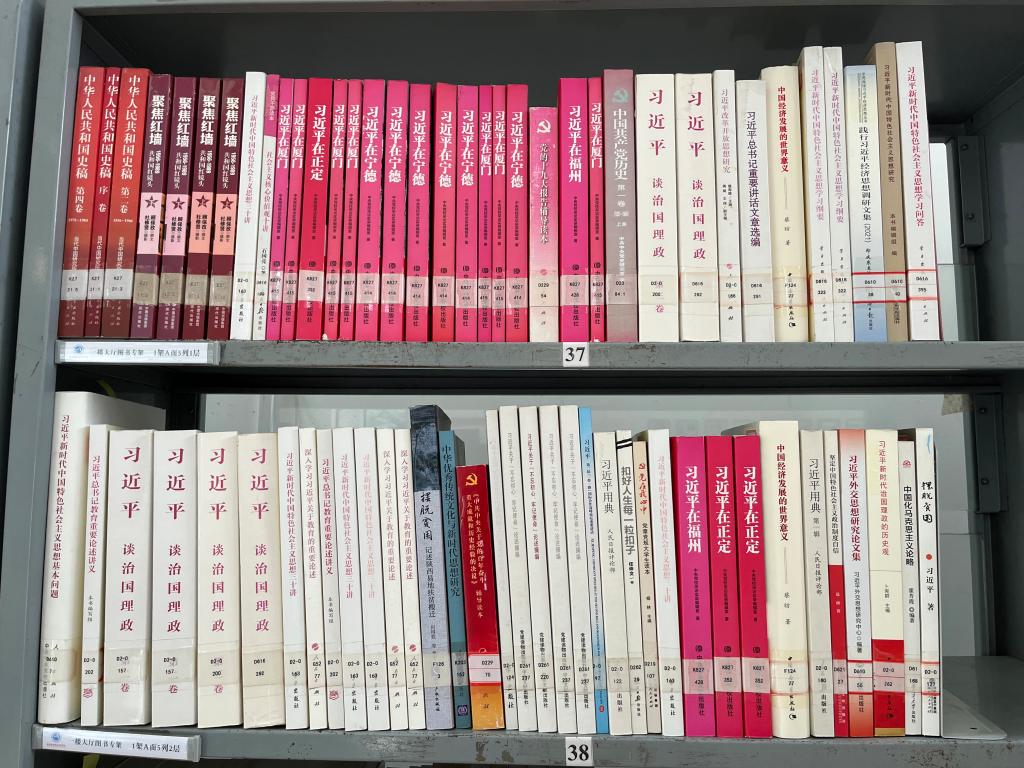 专架陈列了《习近平著作选读》(第一卷、第二卷)、《习近平关于调查研究论述摘编》《习近平新时代中国特色社会主义思想专题摘编》《习近平新时代中国特色社会主义思想学习纲要(2023年版)》等主题教育重要学习材料,以及习近平新时代中国特色社会主义思想其他相关图书,包括习近平总书记著作、论述摘编、学习读本、工作足迹、思想研究、系列重要讲话、语言典故等共计500余册,可供广大师生前往借阅。