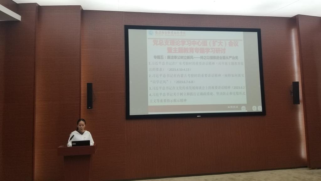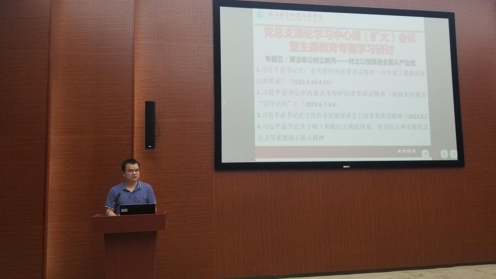 参观结束后,全体中心组成员在博物馆多功能厅召开党总支理论学习中心组(扩大)会议暨主题教育专题学习研讨,医学院党总支书记邱滚忠主持会议。与会人员围绕主题教育专题五:廉洁奉公树立新风——持之以恒推进全面从严治党进行集中学习研讨。医学院副院长邓元荣、副书记陈洁结合专题学习进行交流分享。