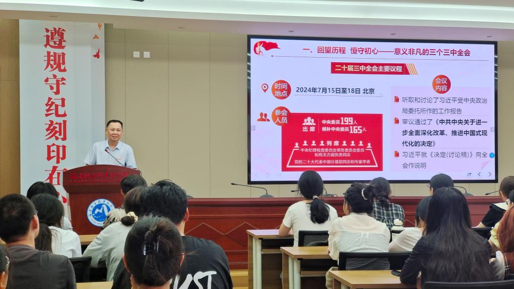 党的二十届三中全会是在以中国式现代化全面推进强国建设、民族复兴伟业的关键时期召开的一次里程碑式会议,具有继往开来的重要意义。为引领全校师生进一步兴起学习宣传贯彻全会精神热潮,增强坚定不移沿着习近平总书记指引的道路勇毅前行的改革定力,9月12日至19日,校党委书记曾武祈、校长许能锋、党委副书记李美华、纪委书记游锋和副校长黄铭珊、周雄、朱扶蓉纷纷走上讲台,为我校上千名党政干部和师生代表讲授形势政策课。