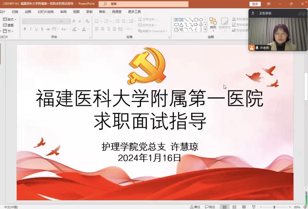 为进一步加强毕业生就业指导与服务工作,提升就业竞争力,认真落实“我为学生办实事”,1月16日晚,护理学院学生第一党支部通过腾讯会议开展福建医科大学附属第一医院求职面试指导讲座,着力解决学生最关心、最直接、最现实的问题。本次培训由党总支专职组织员许慧琼主讲,130多位同学线上聆听。