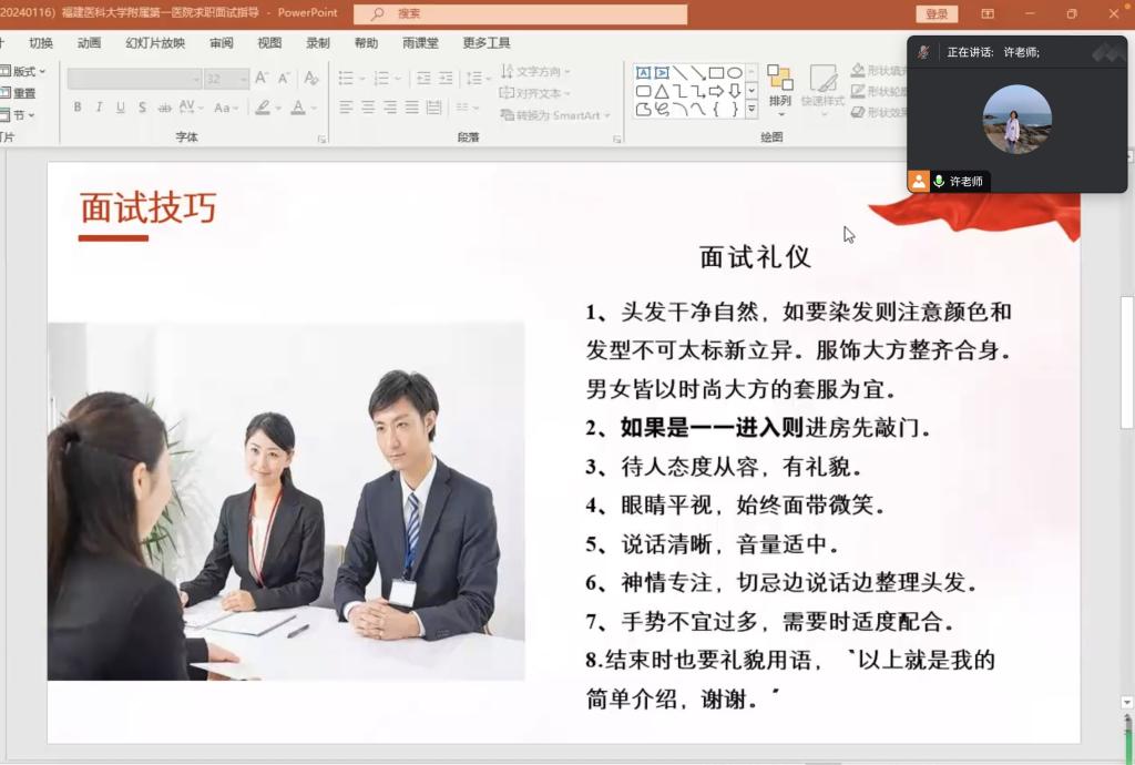 许慧琼结合多年就业指导经验,从面试礼仪和面试自我介绍两方面详细为进入福建医科大学附属第一医院招聘考试面试环节同学深入讲解面试技巧。