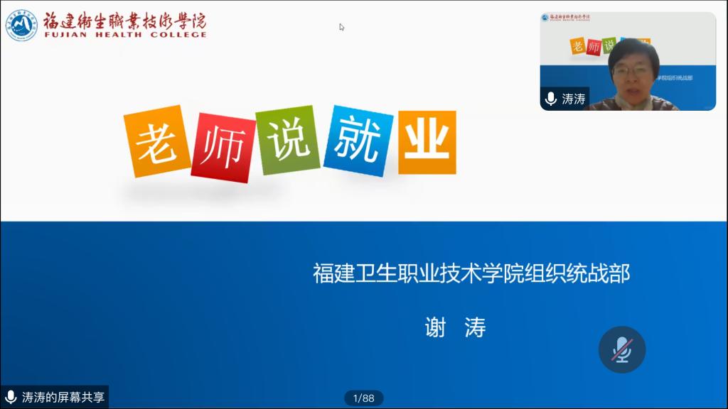 为贯彻落实全国、全省2024届普通高校毕业生就业创业工作会议精神,帮助毕业生高质量充分就业,切实发挥党建引领作用,聚焦解决学生“急难愁盼”问题,1 月24 日,护理学院学生第一党支部线上开展“老师说就业”主题党日活动,本次讲座邀请到原护理学院党总支书记、现任校党委组织统战部部长谢涛为护理学院2024届毕业生做专题分享,学生第一党支部书记吴锋主持会议,护理学院270多位同学线上聆听。