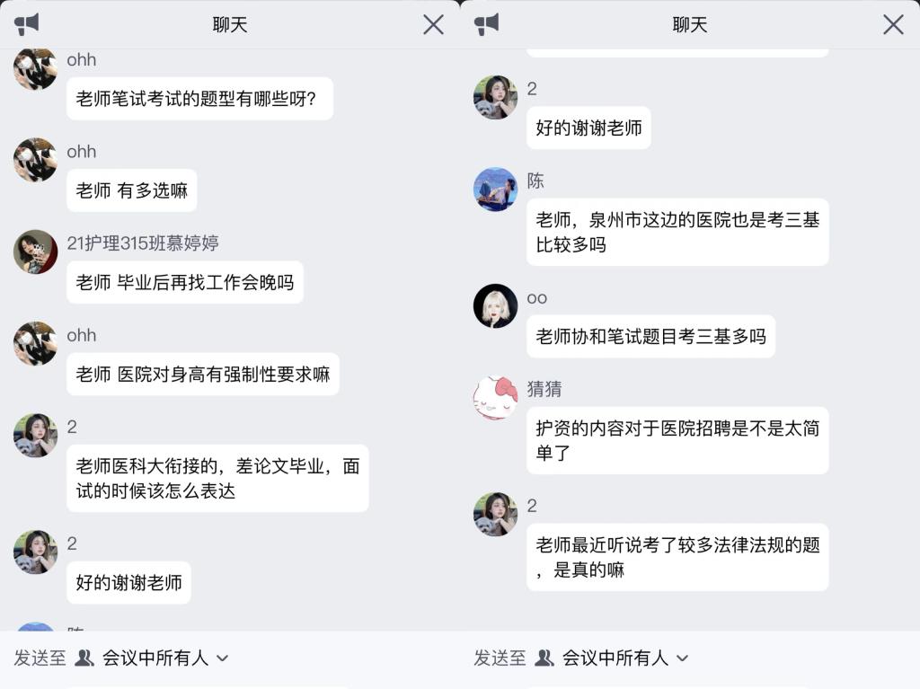 21护理307班许子怡表示:在整个分享会过程中,老师以专业又联系实际的方式,让我们深入了解了关于招聘考试内容复习方法。指导我们如何着装、发型、妆容、形体仪态,为我们在困惑担忧之际带来了很多解决办法,老师针对各个医院备考复习的内容,让我本无目的的复习豁然开朗。