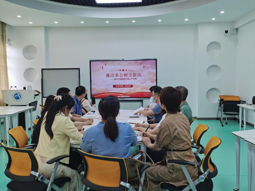 2023年5月25日,药学院第二党支部围绕“廉洁奉公树立新风——持之以恒推进全面从严治党”开展专题学习。本次专题学习由支部书记刘丹丹主持。