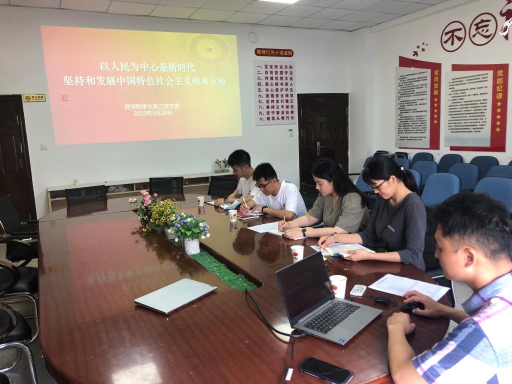5月26日,药学院学生第三党支部书记陈翰在药学院会议室开展题为《以人民为中心是新时代坚持和发展中国特色社会主义根本立场》的党课,学生第三党支部全体教师党员参与。