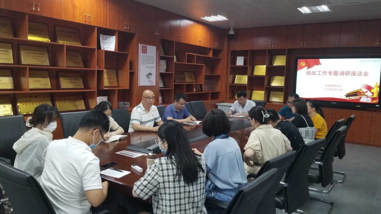 为推进主题教育走深走实,扎实开展调查研究工作,进一步加强统战人士思想政治引领,6月14日下午,医学院就主题教育相关要求开展统战工作专题调研座谈会。会议由党总支书记邱滚忠主持,党总支及各党支部统战委员,学院各民主党派教师、党外教师代表参会。