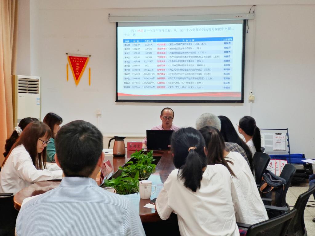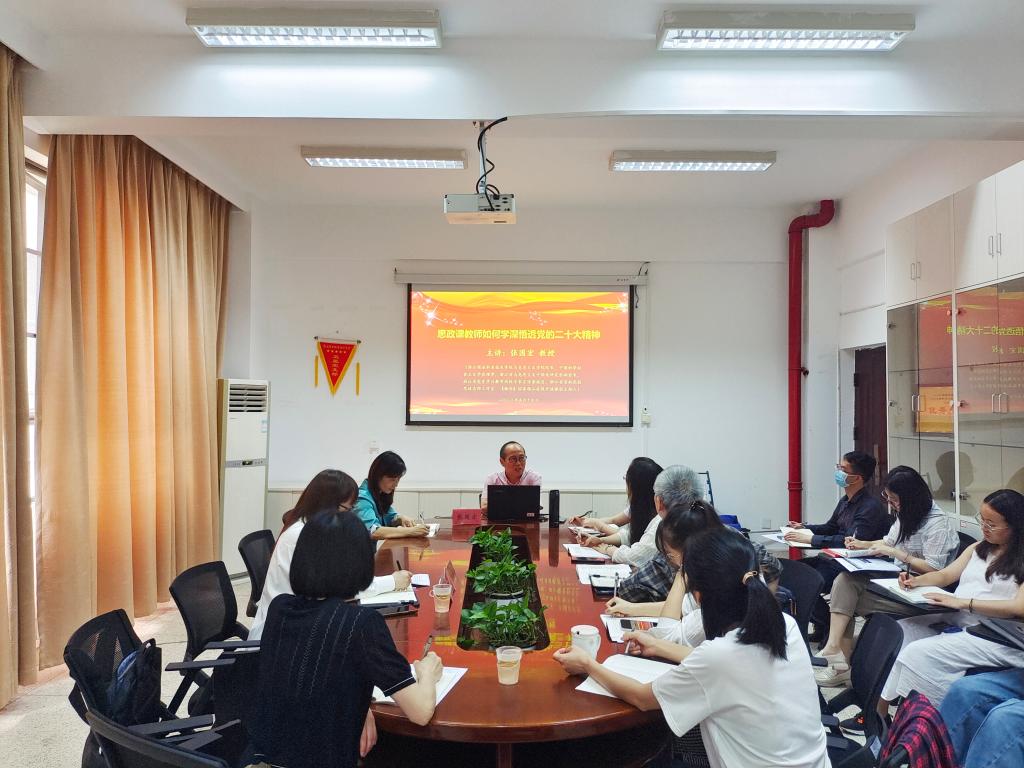 为全面、准确、深刻地理解把握习近平新时代中国特色社会主义思想,在深度融入课程教学中学好党的二十大精神,2023年5月19日,我校邀请浙江商业职业技术学院马克思主义学院张国宏教授在行政楼107楼会议室作题为《思政课教师如何学深悟透党的二十大精神》的专题讲座。讲座由马克思主义学院院长熊美兰主持,全体思政课教师参加。