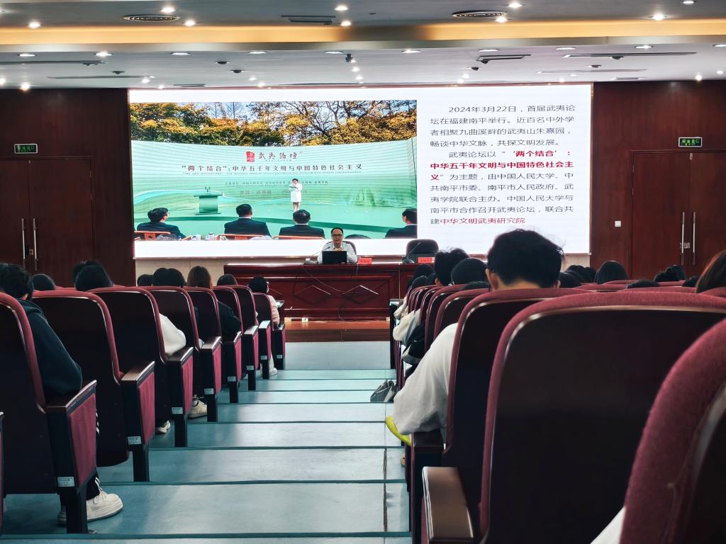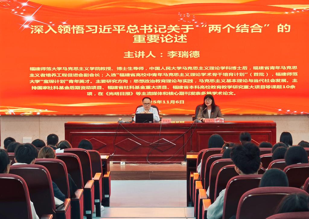 为深入学习贯彻习近平新时代中国特色社会主义思想,贯彻落实党的二十届四中全会精神,系统把握“两个结合”这一重大理论创新的精髓要义,11月6日,我校邀请福建师范大学马克思主义学院副院长、教授、博士生导师李瑞德在笃行楼四楼报告厅开展《深入领悟习近平总书记关于“两个结合”的重要论述》专题讲座。讲座由马克思主义学院党总支书记、院长熊美兰主持,马克思主义学院全体专兼课教师及学生代表参加。