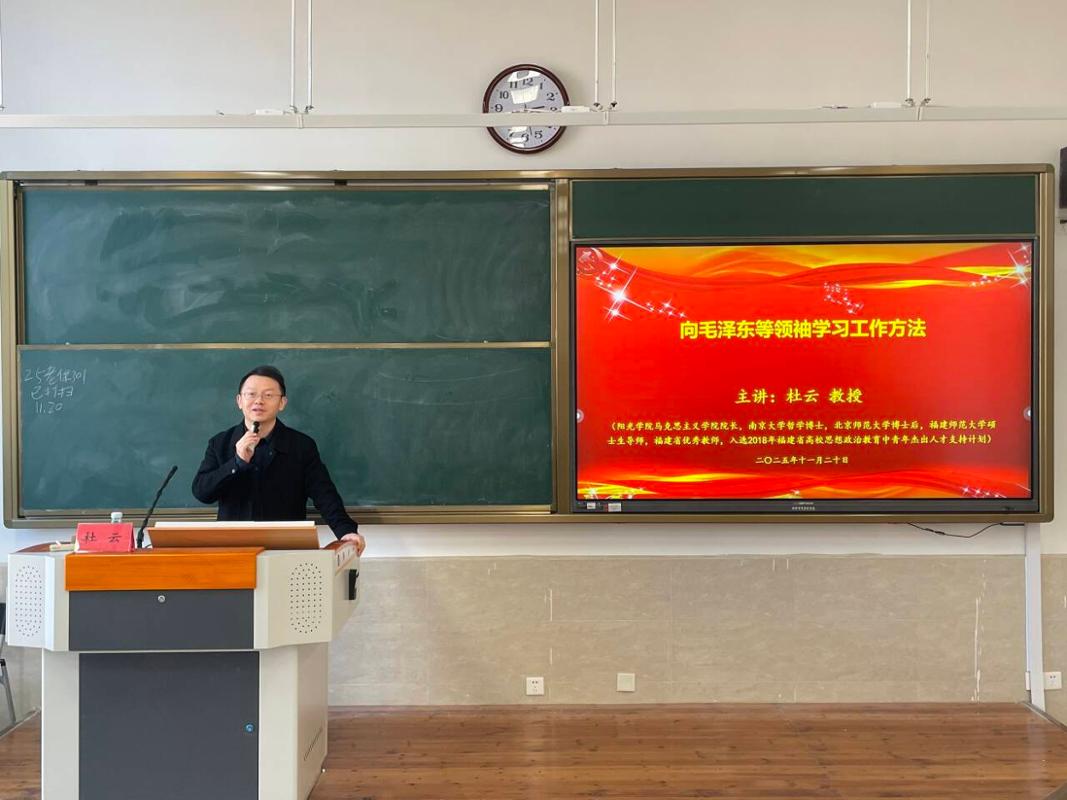 为深入学习贯彻党的二十届四中全会精神,深化马克思主义理论教育,传承红色基因中蕴含的宝贵思想方法与工作智慧,切实将全会精神转化为育人实效与师生成长动能,11月20日,我校特邀阳光学院马克思主义学院院长杜云在崇健楼205开展《向毛泽东等领袖学习工作方法》专题讲座。讲座由马克思主义学院副院长来朋珍主持,马克思主义学院全体教师及学生代表参加。