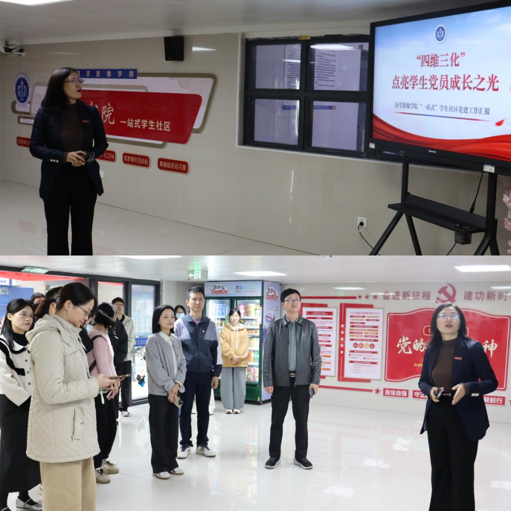 在参观交流过程中,双方围绕“一站式”社区建设中的组织架构搭建、育人资源整合、学生参与机制及智慧化服务等关键问题展开深入探讨。吴文捷老师围绕“‘四维三化’:点亮学生党员成长之光”的核心思路,系统介绍了该院党建进社区工作模式。通过“夯基石”“重引领”“强管理”“助成才”四个维度,达成党员培养标准化、思想教育常态化、素质提升多元化。