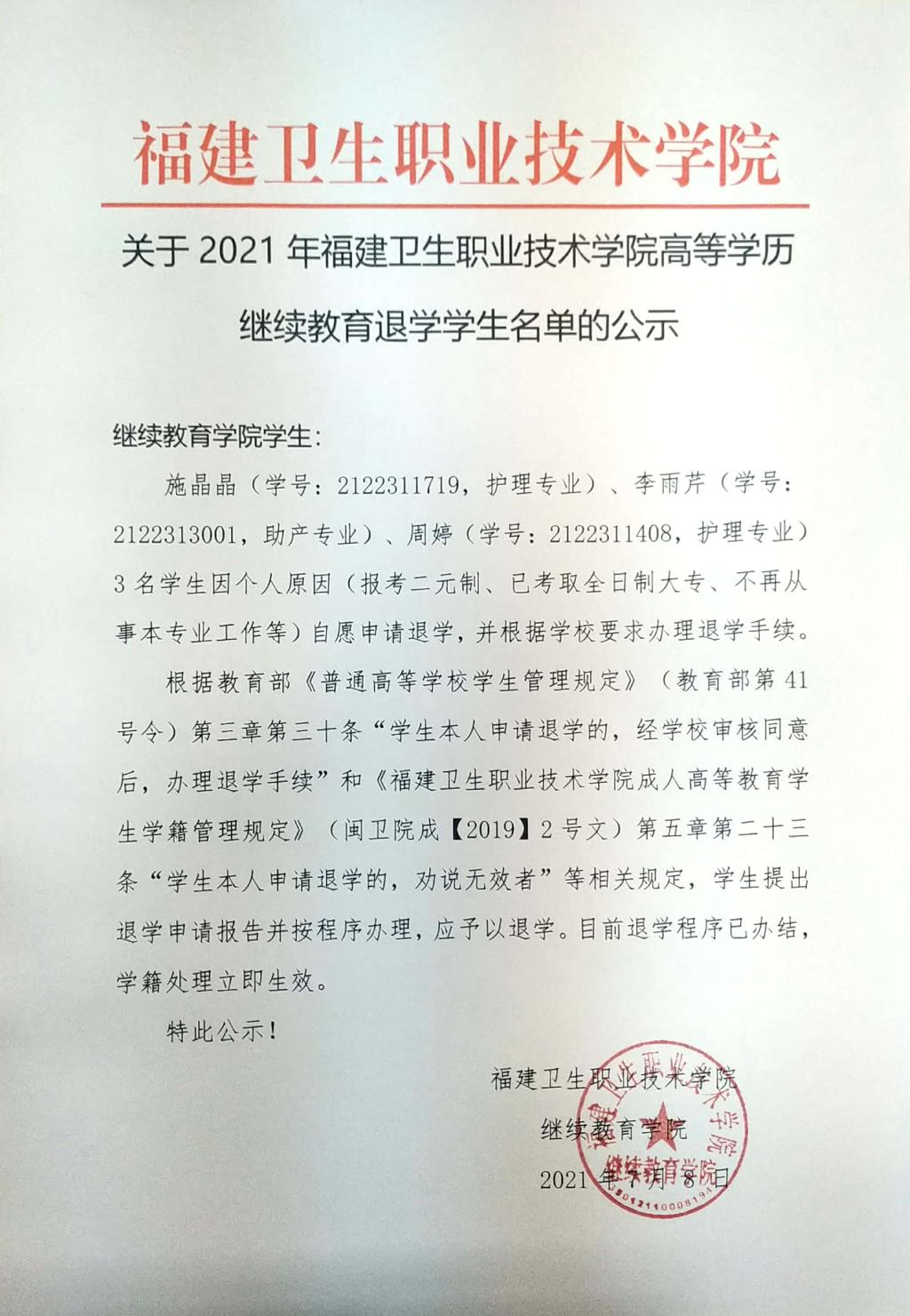关于2021年福建卫生职业技术学院高等学历继续教育施晶晶等3名退学学生名单的公示