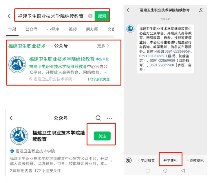 观看方法二:手机微信点击搜索并关注“福建卫生职业技术学院继续教育”公众号,导览栏点击“开学典礼”,点击直播观看。如下图: