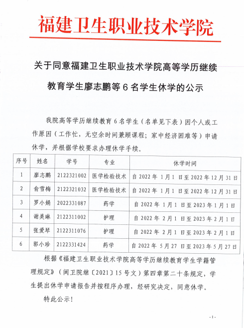 关于同意福建卫生职业技术学院高等学历继续教育学生廖志鹏等6名学生休学的公示