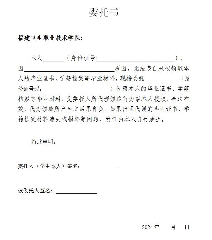 请学生本人携带身份证原件在规定时间到校领取毕业证及档案。若是本人因特殊情况无法到校领取需委托亲属代领的,代领时请携带委托书、委托人和被委托人的身份证原件和复印件(委托书和复印件提交留存)。